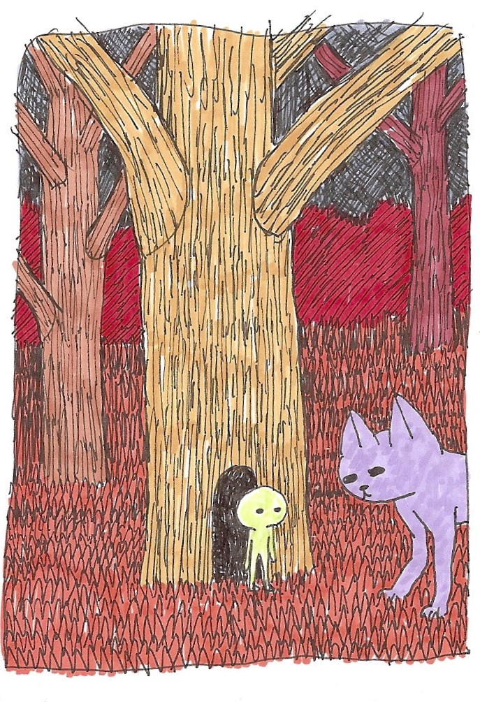 the little green man in the tree being visited by a purple cat